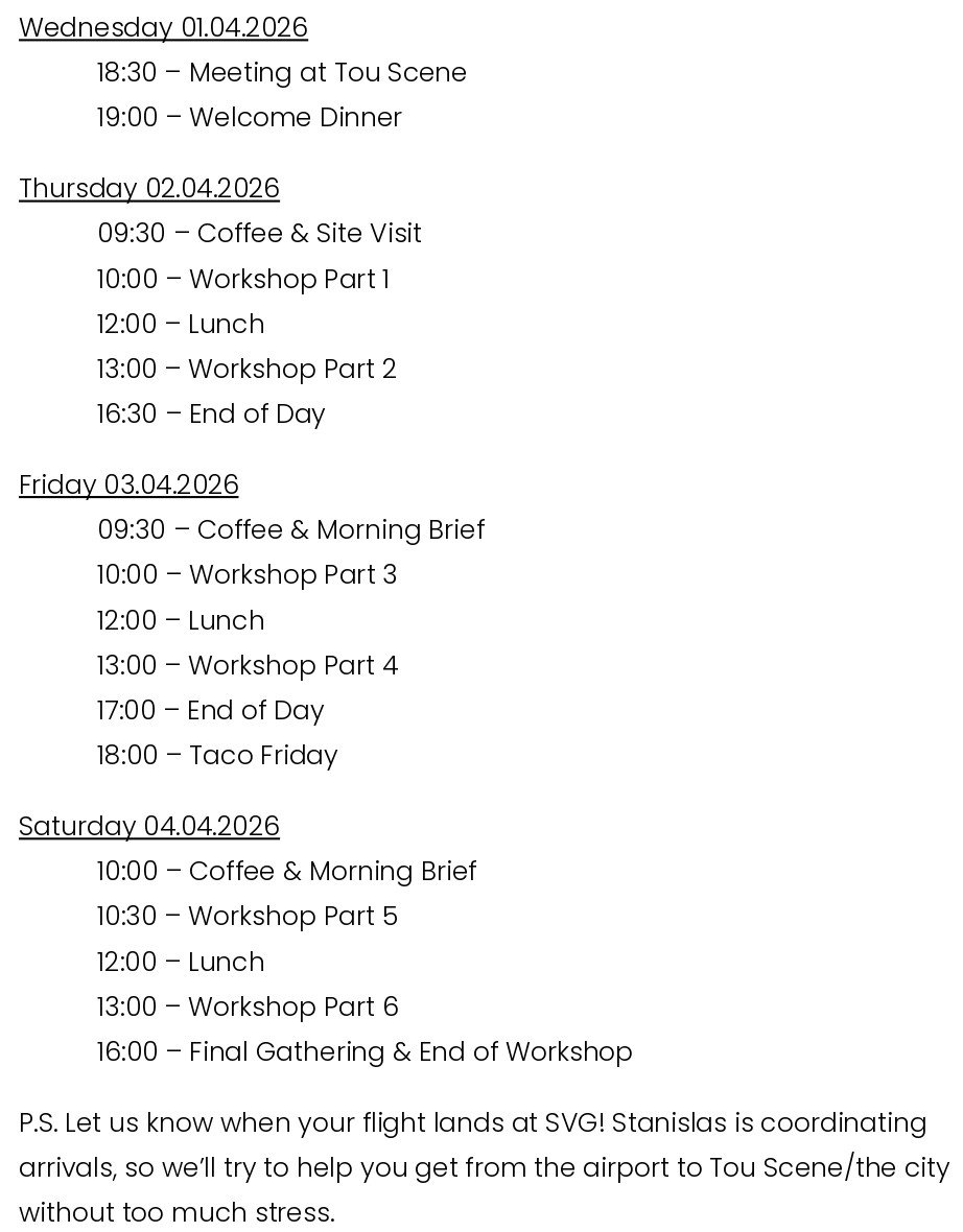 Design workshop: April 1st-4th. Scroll down to view the workshop schedule.